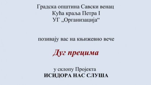 KNjIŽEVNO veče pod nazivom "Dug precima" u sklopu projekta "Isidora nas sluša" održaće se u petak, 29. aprila, od 19.00 časova u Kući kralja Petra Prvog na Savskom vencu.