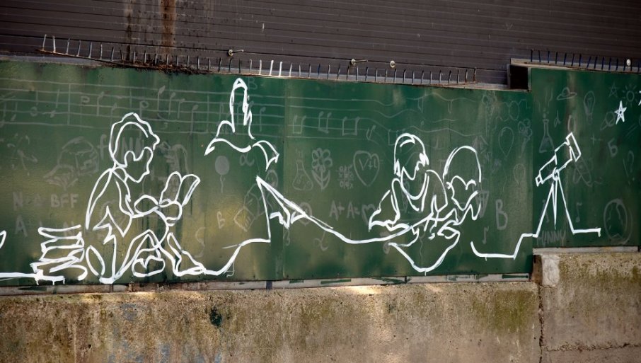 - Motiv nam je bila školska tabla, koja je zelene boje, sve je nacrtano belom kredom, povezano jednom linijom kao da je u dahu urađeno - objašnjavaju nam autori. - Kao predavanja koja traju, nastavljaju se. Rad se decom je bio divan. Oni su sjajni, pomagali su nam, davali ideje. Divno iskustvo.