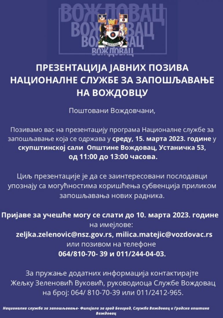 Prijave za učešće mogu se slati do 10. marta 2023. godine na imejlove: zeljka.zelenovic@nsz.gov.rs, milica.matejic@vozdovac.rs ili pozivom na telefone 064/810-70- 39 i 011/244-04-03.