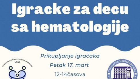 STUDENTSKI parlament Stomatološkog fakulteta Univerziteta u Beogradu zajedno sa Udruženjem studenata stomatologije Srbije, organizuje sutra u periodu od 12 do 14 časova humanitarnu akciju prikupljanja igračaka za decu koja se leče na odeljenju za hematologiju "Instituta za majku dete".