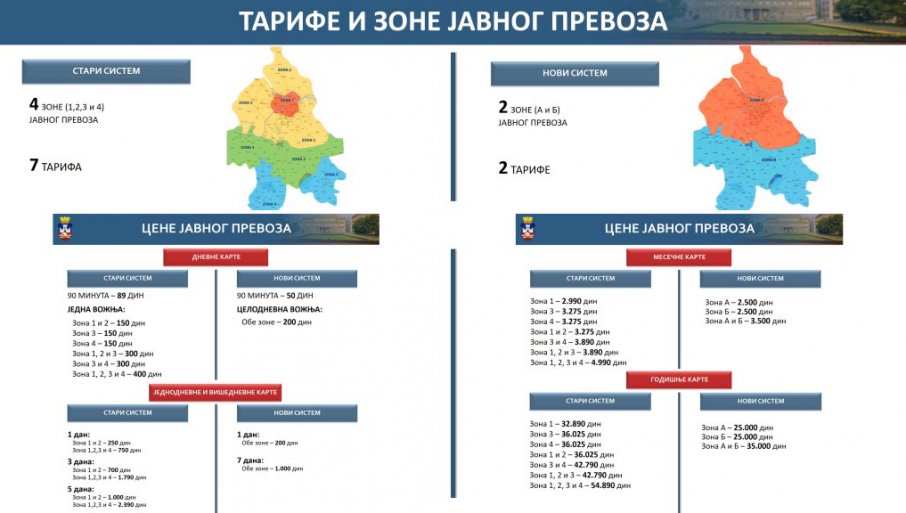 – Teritorija grada više neće biti podeljena na četiri zone sa sedam tarifa, već će ubuduće grad biti podeljen na dve zone i postojaće dve tarife. Vremenska karta za 90 minuta nakon sugestije brojnih korisnika, koji su mi se juče javili, ostaje, ali smo odlučili da joj smanjimo cenu. Koštala je 89 dinara, a sada će i u zoni A i u zoni B biti 50 dinara, što je skoro duplo manje. Celodnevna karta za obe zone, koja će moći da se koristi za teritoriju čitavog grada, koštaće samo 200 dinara, što je najveće pojeftinjenje jer je do sada za sve zone bila 750 dinara. Karta za sedam dana koštaće samo hiljadu dinara, a ranije je za pet dana koštala 2.390 dinara. Sledeća velika stvar jeste cena mesečnih karata, koja se kretala od 2.990 do 4.990 dinara, u zavisnosti od zone. Sada će zona A ili zona B biti 2.500 dinara, a obe zone 3.500 dinara – istakao je Šapić.