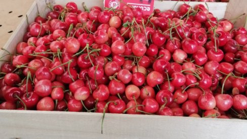 Na jednoj tezgi bilo je i trešanja, koje su se prodavale 600 dinara po kilogramu. Nakupci kažu da će one uskoro stići u većim količinama.