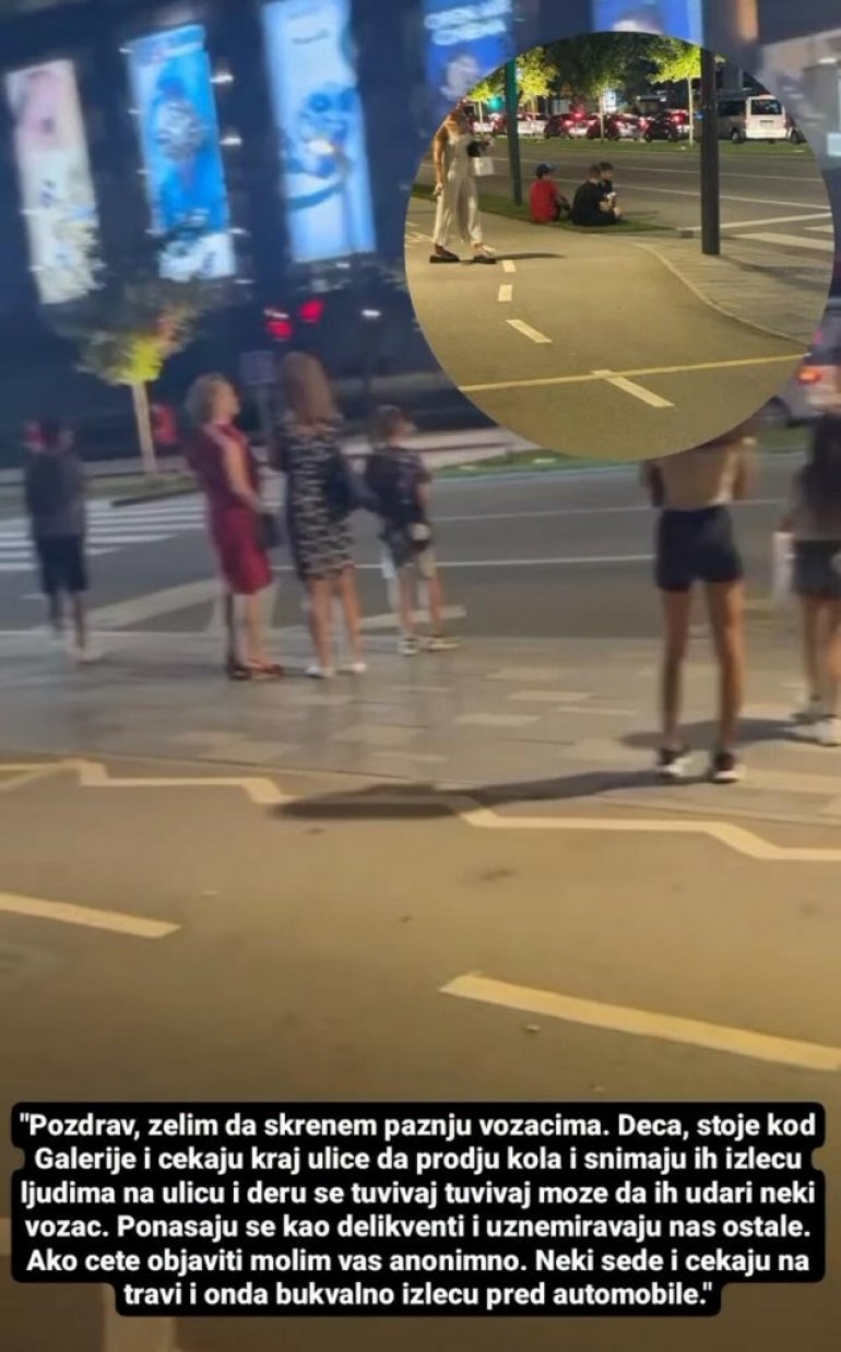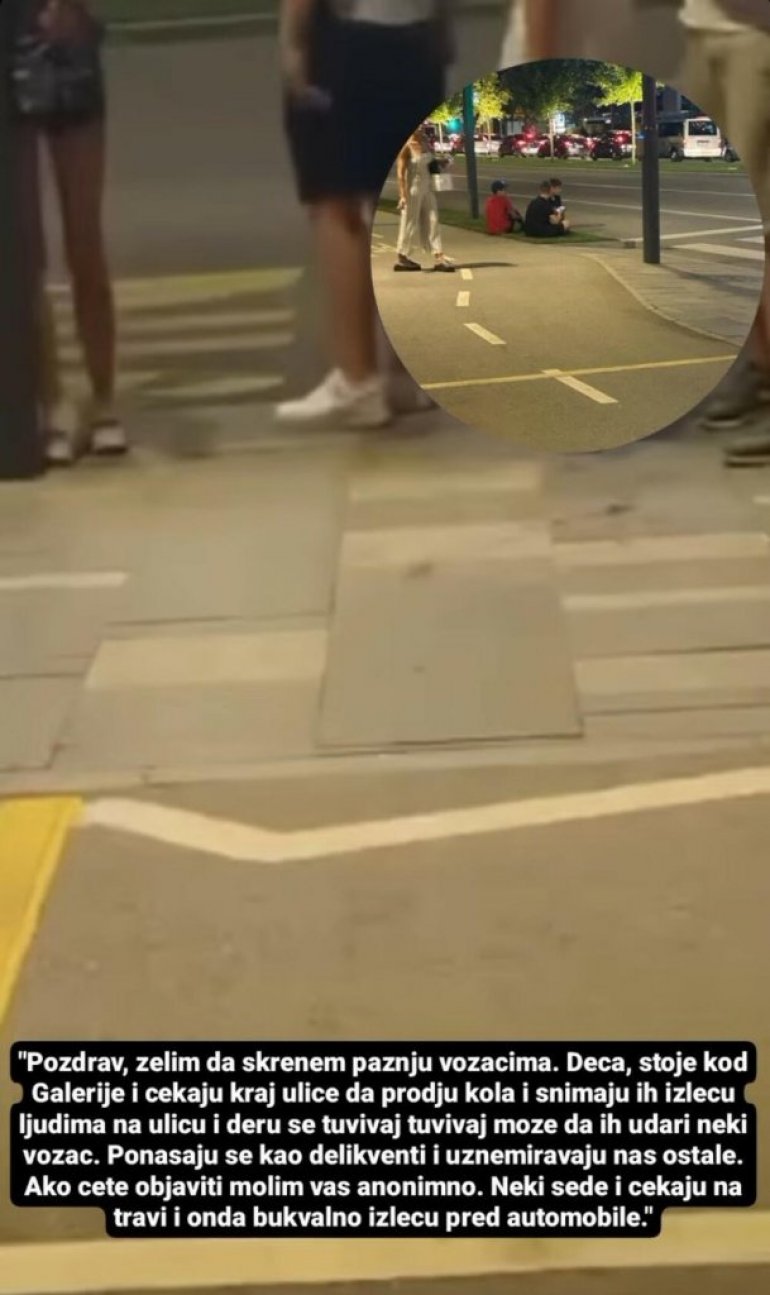 - Želim da skrenem pažnju vozačima. Deca stoje kod Galerije i čekaju kraj ulice da prođu kola i snimaju ih i izleću ljudima na ulici i deru se "tuvivaj, tuvivaj". Može da ih udari neki vozač. Ponašaju se kao delikventi i uznemiravaju nas ostale Neki sede i čekaju na travi i onda bukvalno izleću ispred automobile - piše u objavi na Instagramu.