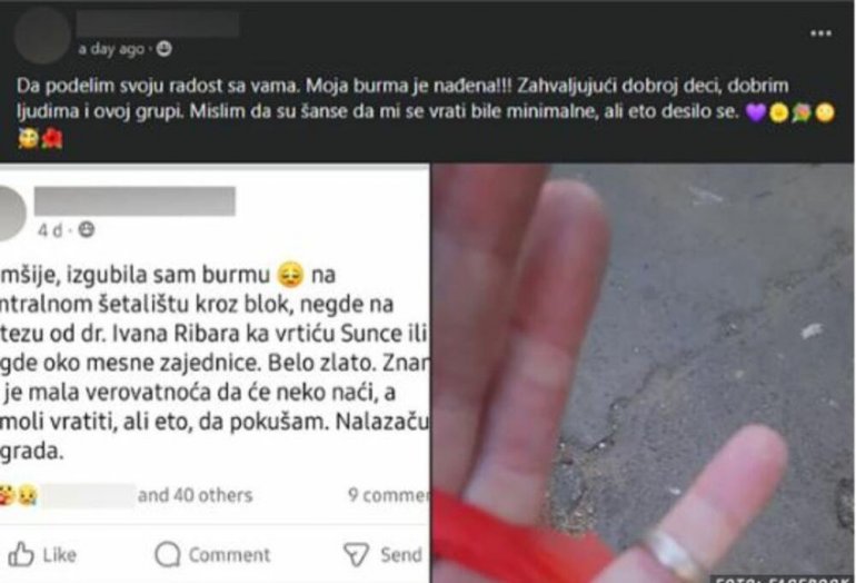 Jelena je na Novom Beogradu izgubila svoju burmu od belog zlata i nije verovala da će je iko pronaći, a kamoli vratiti. Ipak, pokušala je, pa je u Fejsbuk grupi Blok 45 Info objavila da traga za svojim prstenom.