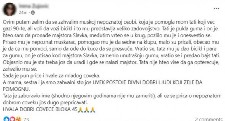 Ovim putem zelim da se zahvalim muškoj nepoznatoj osobi, koja je pomogla mom tati koji već gazi 90-te, ali voli da vozi bicikl i to mu predstavlja veliko zadovoljstvo - počela je ona, pa nastavila: