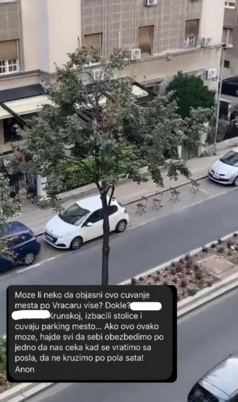 - Može li neko da objasni ovo čuvanje mesta po Vračaru više, dokle?! Izbacili stolice i čuvaju parking mesto. Ako ovo ovako može, hajde da sebi svi obezbedimo po jedno da nas čeka kad se vratimo s posla, da ne kružimo po pola sata - piše u objavi.