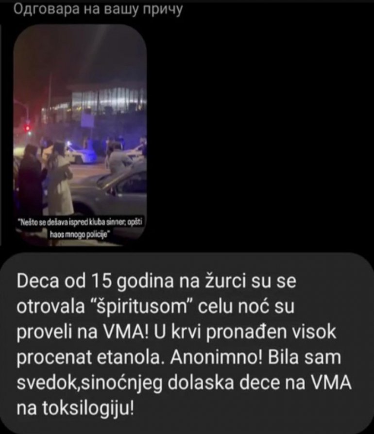 - Deca od 15 godina na žurici su se otrovala špiritusom i celu noć su proveli na VMA. U krvi im je pronađen visok procenat etanola. Bila sam svedok sinoćnjeg dolaska dece na toksikologiju - navodi se na storiju.
