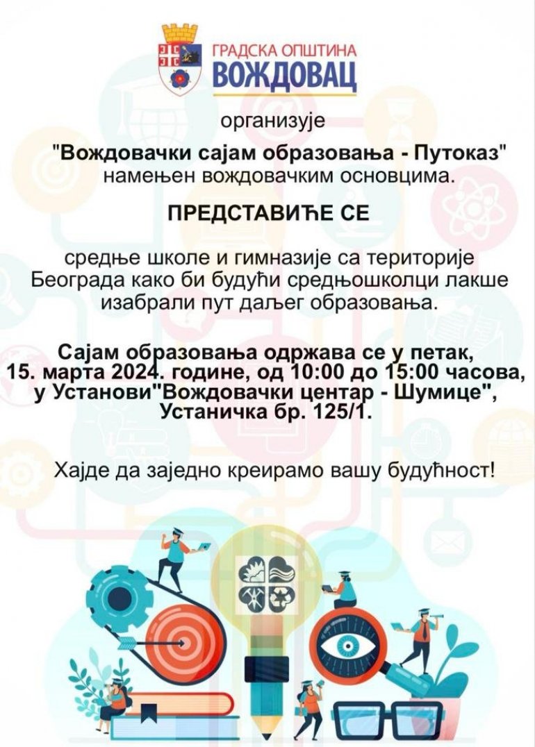 - Dragi budući srednjoškolci, kako bismo vam pomogli u odluci koju srednju školu ili gimnaziju da odaberete za sebe, organizovali smo, sada već tradicionalno, Sajam obrazovanja. Na njemu će se okupiti učenici i nastavnici iz beogradskih škola sa kojima ćete moći da razgovarate o svemu što vas interesuje i dobijete informacije o tome šta vas čeka u školi i šta ćete moći da radite kada je završite. Pozivamo vas da dođete na „Voždovački sajam obrazovanja – Putokaz“ da zajedno skrojimo vaš akademski uspeh - navedeno je u saopštenju iz ove beogradske opštine.