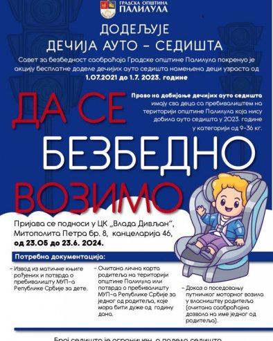 RODITELjI mališana sa Palilule od danas do 23. juna moći će da se prijave za besplatnu akciju dodele auto-sedišta.