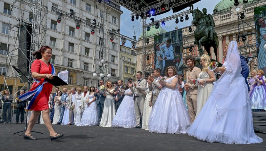 KOLEKTIVNO venčanje organizovano je danas u centru Beograda, a 12 parova reklo je jednoglasno sudbonosno "da".