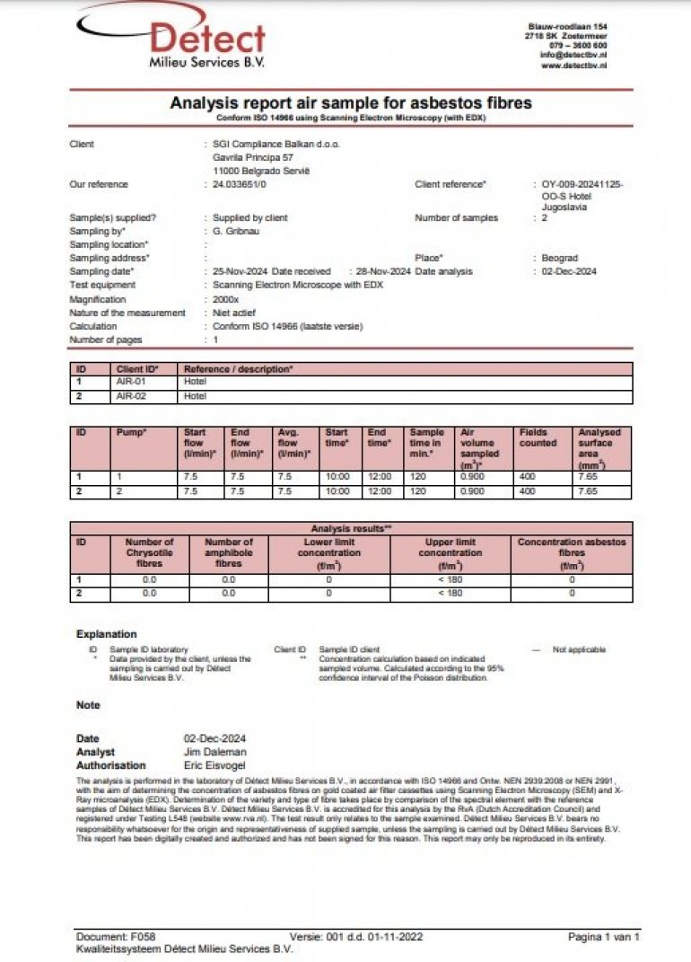 Merenja vazduha sprovedena su 25. novembra 2024. pomoću specijalnih pumpi za uzorkovanje, a laboratorijski rezultati jasno pokazuju odsustvo azbestnih vlakana.