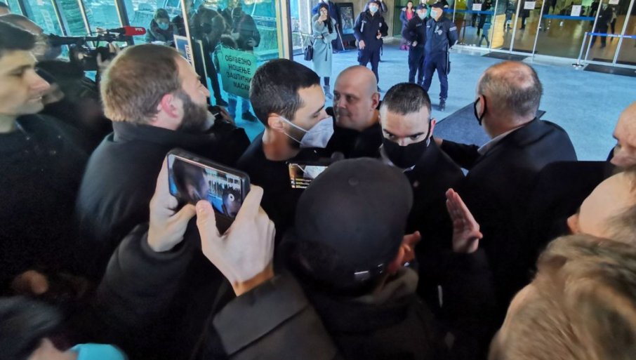 Okupljeni su oko ulaza i pokušavaju da uđu u salu, a u jednom trenutku je došlo do komešanja i verbalnog sukoba pripadnika obezbeđenja i okupljenih građana.