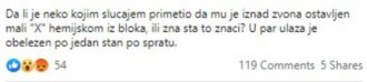 " I mi smo to videli pre nekoliko nedelja, blok 64", "Kod moje bake u soliterima je izrezbaren "X" kod zvona, pre oko 3 nedelje. Za svaki slučaj je izgulila nožem", "Nama je obeležen. Nismo ni primetili, upozorio nas je dostavljač pice pre nekih mesec dana", nizali su se komentari.