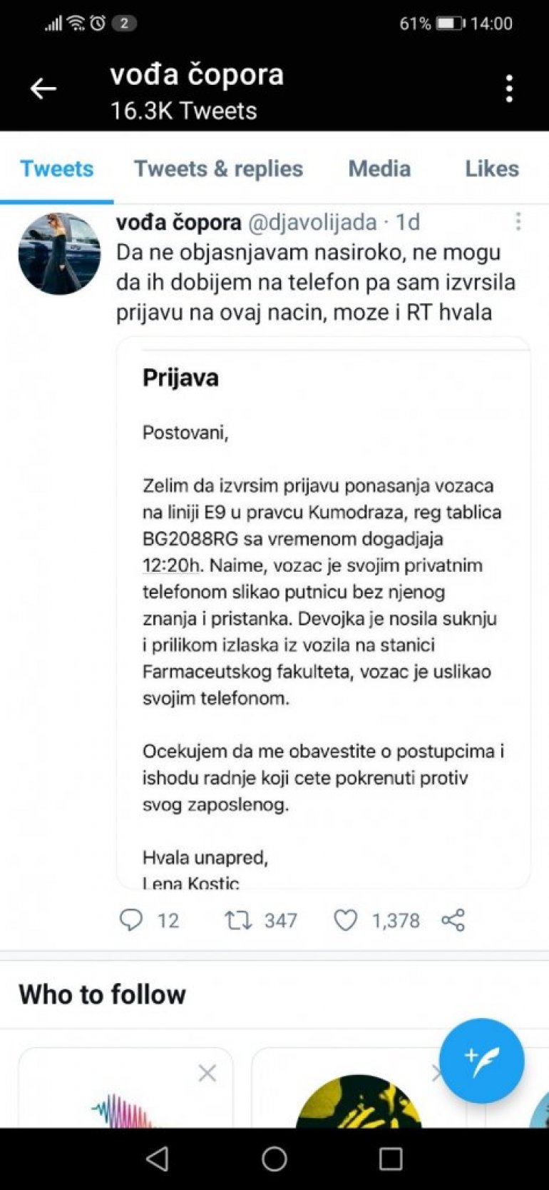 - Желим да пријавим понашање возача на линији Е9 у правцу Кумодража у 12.20 сати, регистарских таблица БГ2088РГ. Наиме, возач је својим приватним телефоном сликао путницу без њеног знања и пристанка. Девојка је носила сукњу и приликом изласка из возила на станици Фармацеутског факултета, возач ју је усликао својим телефоном - написала је Лена К.