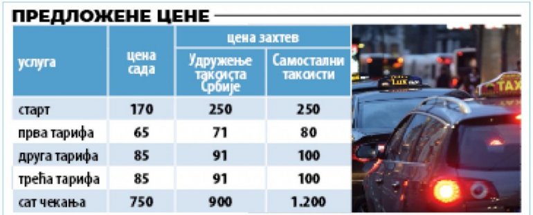 УКОЛИКО Влада Србије до следеће среде одговори захтевима које су пре три месеца поднели београдски таксисти, цена услуге у престоници требало би да се повећа 22 одсто, што ће бити прво поскупљење после десет година! Како за "Новости" истиче председник Удружења таксиста Србије Александар Бјелић, нових протеста до доношења одлуке неће бити, док независни такси превозници најављују блокаду града од 21. до 25. фебруара.