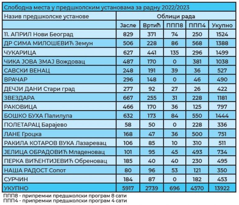 У београдским вртићима има 13.955 места, од којих 5.917 у јаслама, 2.739 у вртићима, 696 у целодневном припремном предшколском програму, 4.570 у четворочасовном пријемном предшколском програму и у развојним групама 33. Највише малишана биће уписано у ПУ "11. април" на Новом Београду - 1.533, а најмање у ПУ "Наша радост" у Сопоту - 350. Родитељи и старатељи ће и ове године конкурисати путем услуге "е-Вртић" на порталу "е-Управе"