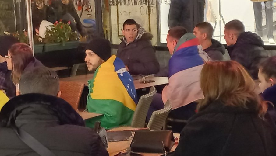 У Кнез Михаиловој улици у једном од кафића једни до других навијачи Бразила и Србије, огрнути заставама и у дресовима својих земаља, навијају за своје фубалере.
