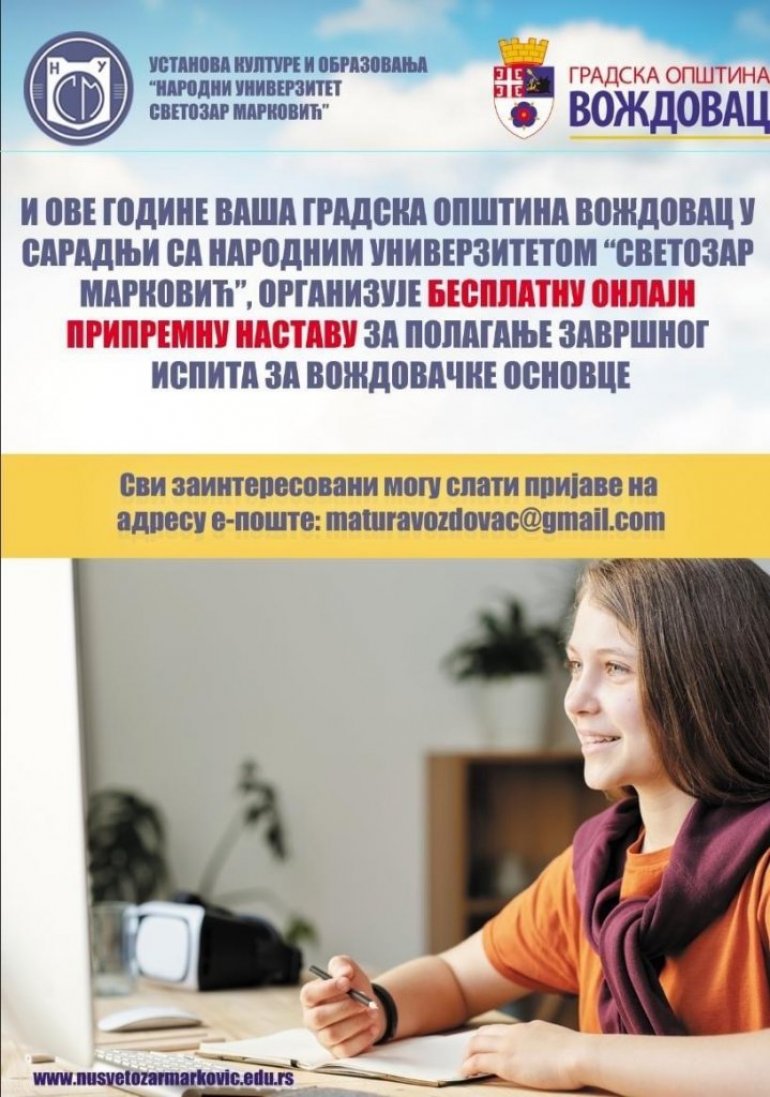 ОПШТИНА Вождовац и Установа кулутре и образовања „Народни универзитет Светозар Марковић“ позивају ученике завршних разреда основних школа да се до 1. марта пријаве на бесплатне онлајн часове припреме за полагање завршног испита.