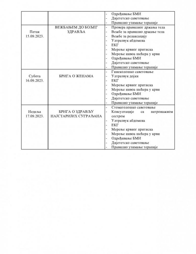 Брига о женама и њиховом здрављу, као и о најстаријим суграђанима резервисана је за суботу и недељу. У суботу ће жене моћи да обаве гинеколошко саветовање и ураде ултразвук дојки, док ће у недељу најстаријим суграђанима бити омогућено стоматолошко саветовање, као и консултације са патронажном сестром.