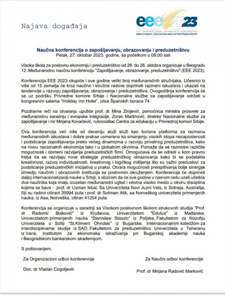 МЕЂУНАРОДНА научна конференција "Запошљавање, образовање, предузетништво" (ЕЕЕ 2023) биће одржана у периоду од 26. до 28. октобра у Београду.