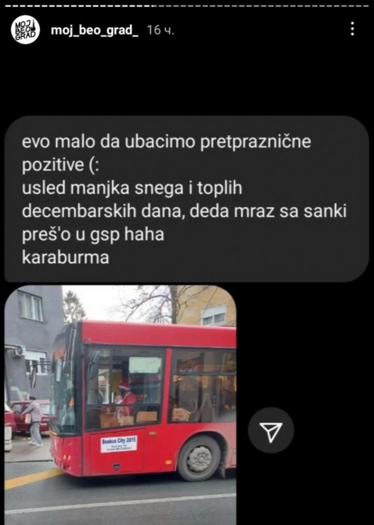 - Ево, мало да убацимо претпразничне позитиве... Услед мањка снега и топлих децембарских дана, Деда Мраз са санки прешао у ГСП. Карабурма - наводи се у једној од објава, док је у другој објављена још једна фотографија.
