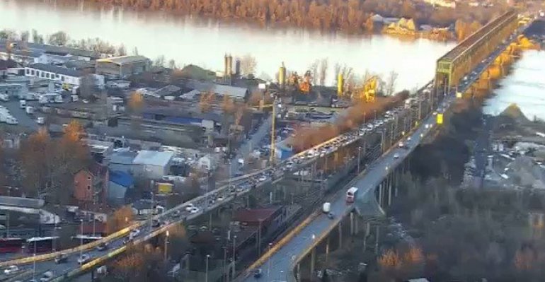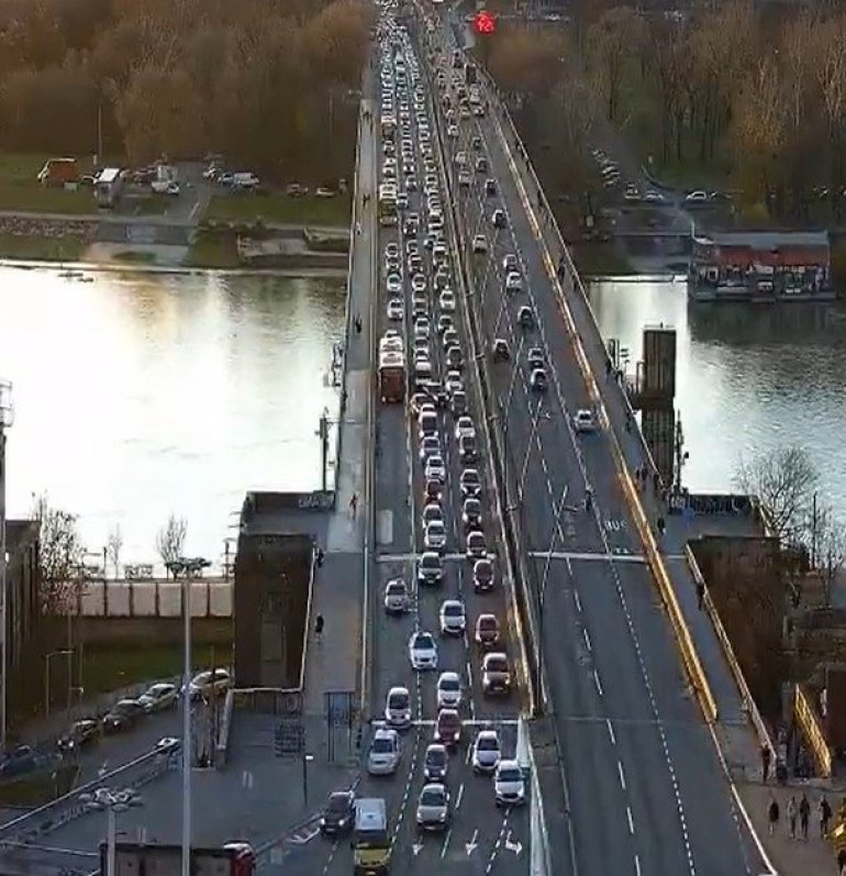 Колона возила у овом тренутку креће се Бранковим мостом, из правца Новог Београда ка центру, а гужве почињу у Булевару Михајла Пупина, нешто пре ТЦ "Ушће". Даље се настављају преко моста и Бранковом улицом.