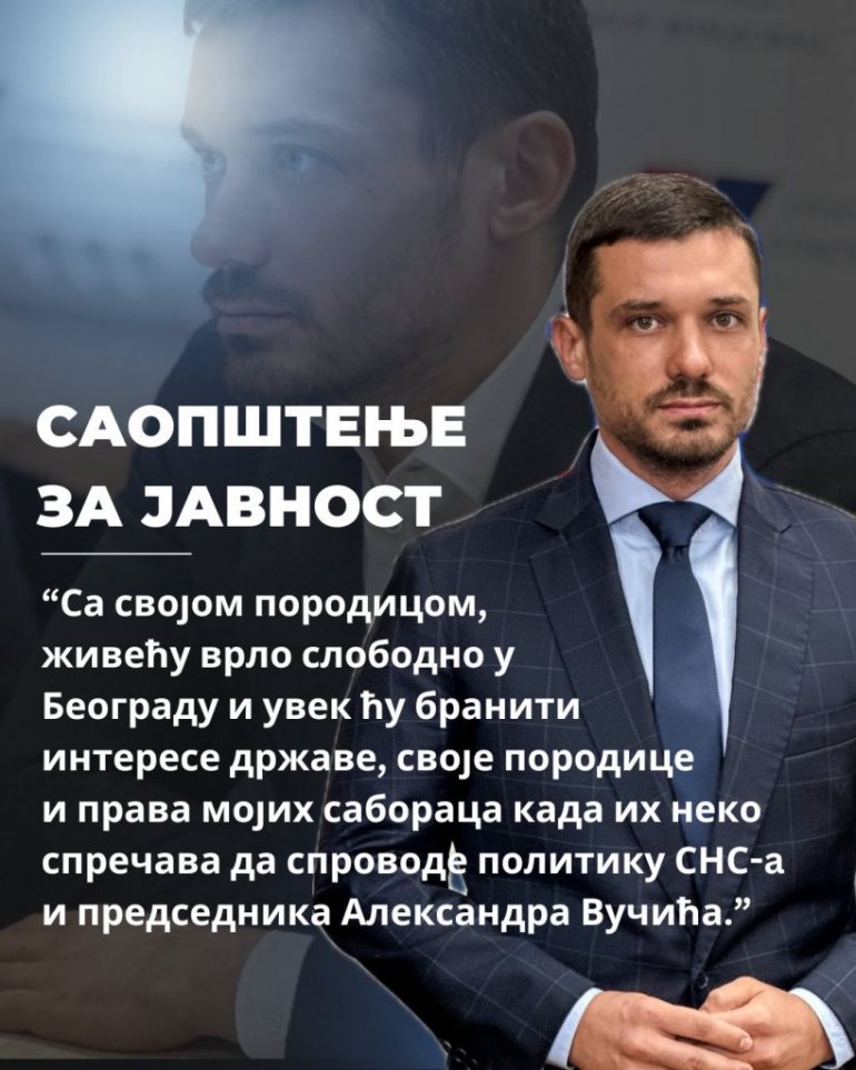 Овим путем обавештавам јавност да ћу живети са својом породицом врло слободно у Београду, за разлику од њихових шефова који имају станове од Беча до Лондона, да ћу увек и свуда бранити интересе државе, своје породице и права мојих сабораца када их неко спречава да спроводе политику СНС и председника Александра Вучића.