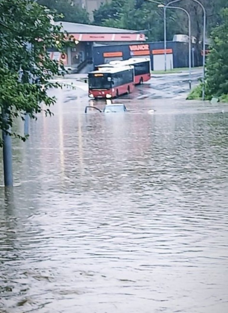 Тако је и у Браће Јерковић где је возило потонуло готово цело. Остао је само да вири део крова...