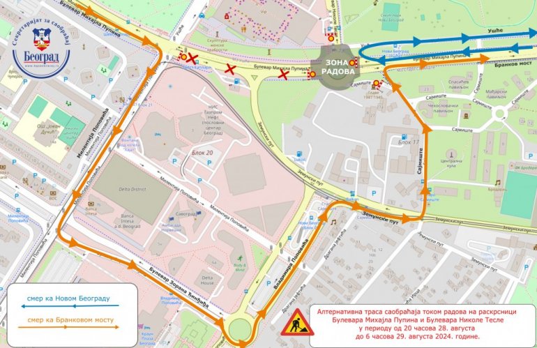 - У среду од 20.00 часова до 6.00 у четвртак биће затворена цела раскрсница где се ради кружни ток. Због тога ће свa возила са Бранковог моста скретати десно у улицу Ушће према Булевару Николе Тесле. Бранковом мосту ће се приступати само из улице Сајмиште. Након завршетка ових радова, кружни ток ће бити пуштен за саобраћај - саопштили су у Секретаријату за саобраћај.