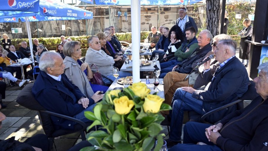 А уз академика Ковачевића, за столом Вукови пријатељи: режисери Емир Кустурица и Љубиша Ристић, главни и одговорни уредник "Вечерњих новости" Милорад Вучелић, некадашњи директор ГАК "Народни фронт" проф. др Душан Станојевић, командант САЈ Спасоје Вулевић, пуковник ЈНА у пензији Веселин Шљиванчанин, проф. др Зоран Ћирковић, сликар Синиша Лабус, каратисткиња Тања Петровић, бивши кошаркаш Партизана Борис Бервас, џудиста Вук Рашовић, некадашњи голман Иван Ћурковић, глумица Лидија Вукићевић, некадашњи градоначелници Београда Небојша Човић и Драган Ђилас...