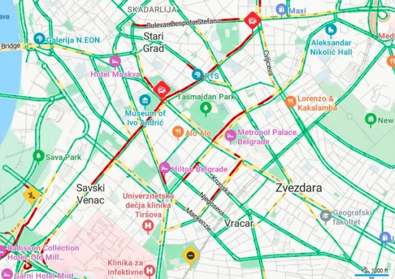 У Таковској улици очекује се задржавање од 11 минута, у Улици кнеза Милоша из правца Булевара краља Александра чак 20 минута, а забележене су и мање гужве у Кнегиње Зорке, Каленићевој, Београдској, Устаничкој, Професора Михаила Ђурића, Булевару деспота Стефана и Поенкаровој.