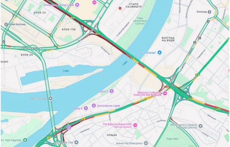 Како се може видети и на мапама, велике гужве у саобраћају су при искључењу са моста Газела на Булевар војводе Мишића у смеру ка Београдском сајму, а где се ових дана одржава Сајам аутомобила.