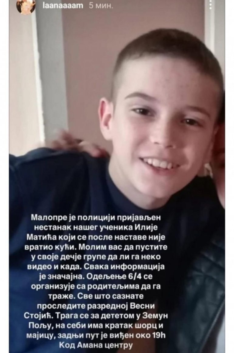 ВЕСТ о нестанку дечака Илије Матића (12) узнемирила је јавност у Србији, а сада се огласио његов отац. Он је потврдио да је дечак нестао синоћ и да су га тражили током ноћи у Земун пољу.