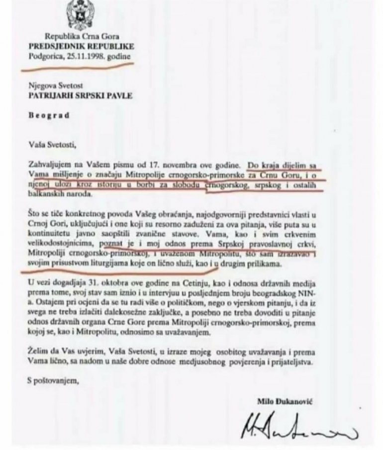 "Новости" су дошле до писма које је својевремено Ђукановић писао патријарху Павлу.