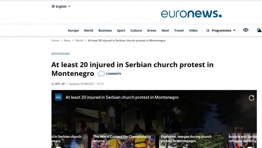 - Најмање 20 људи повређено је у недељу у Црној Гори током сукоба полиције и демонстраната који су покушавали спречити инаугурацију новог поглавара Српске православне цркве. Полиција је такође најавила осам хапшења након насиља које је покварило кратку церемонију устоличења на Цетињу, бившем краљевском граду на југу земље - пише Евроњуз и додаје -Интервентна полиција употребила је сузавац на демонстранте који су рано у недељу испалили хице у ваздух и бацали флаше и камење пре планиране инаугурације новог поглавара Српске православне цркве у земљи. Foto: Printskrin
