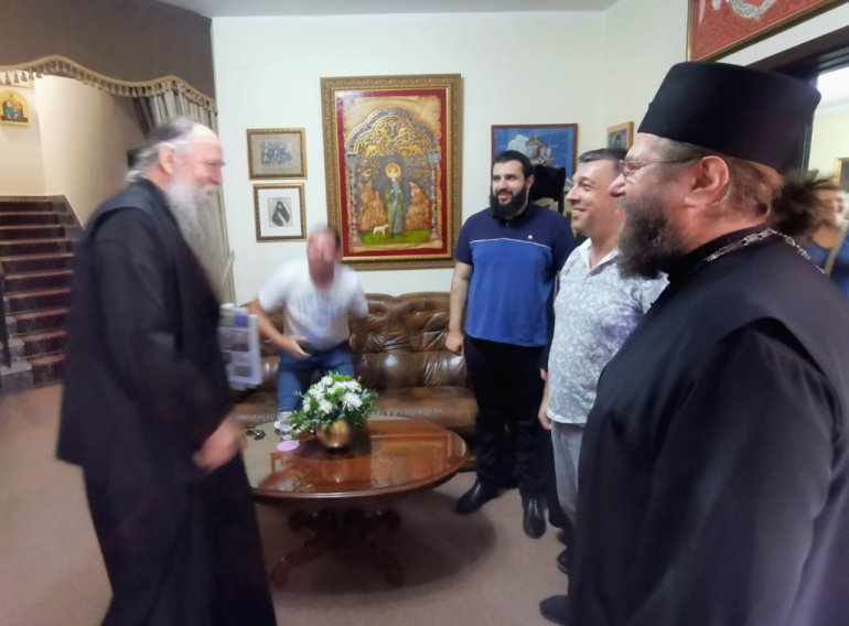 Насмејан и добро расположен, митрополит је примао скромне поклоне од монаштва које је дошло да се поздрави са њим.