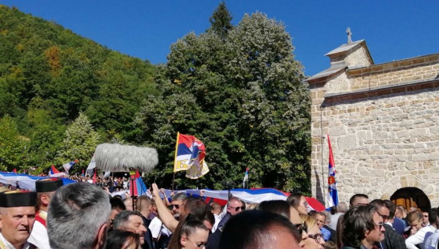 Док околином одјекују црквена звона у порти манастира и испред порте се вијоре српске тробојке.