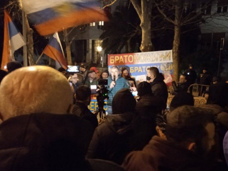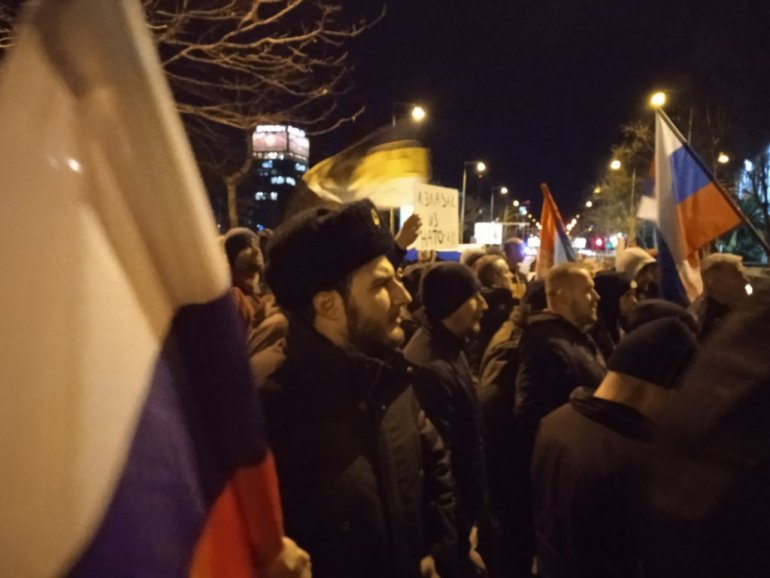 - Овде смо се окупили да подржимо нашу једнородну, једнојезичну, једноверску браћу Русе у борби против инперијалистичке политке која руши Словене. Ми нисмо овде против Украјине, него против Зеленског који гура народ у смрт. Молимо се за мир међу словенском браћом и да одговоара неонациолистичка клика која управља са Украјином. Овде смо ноћас да изразимо протест против срамне и кукавичке политике и бивше и садашње власти, поручено је са скупа.