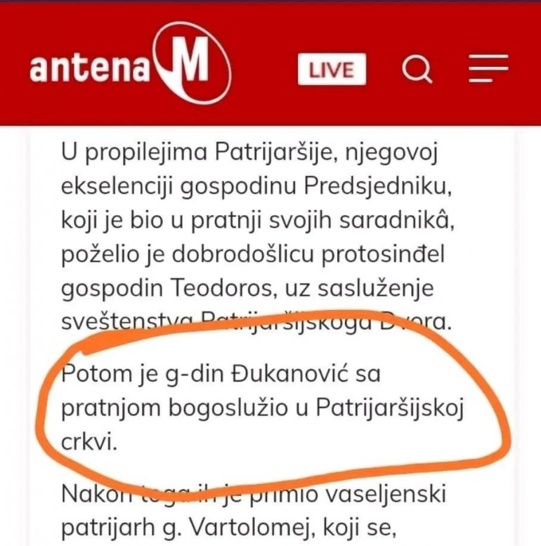 Подгорички портал Борба пренео је саопштење Цариградске патријаршије у којем, између осталог, патријарх Вартоломеј након састанка са црногорским председником говори и о крштењу унука црногорског председника.