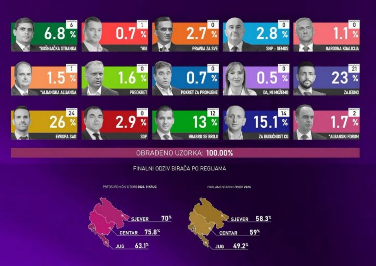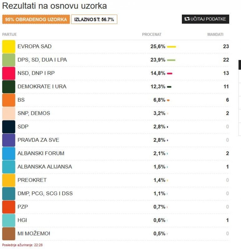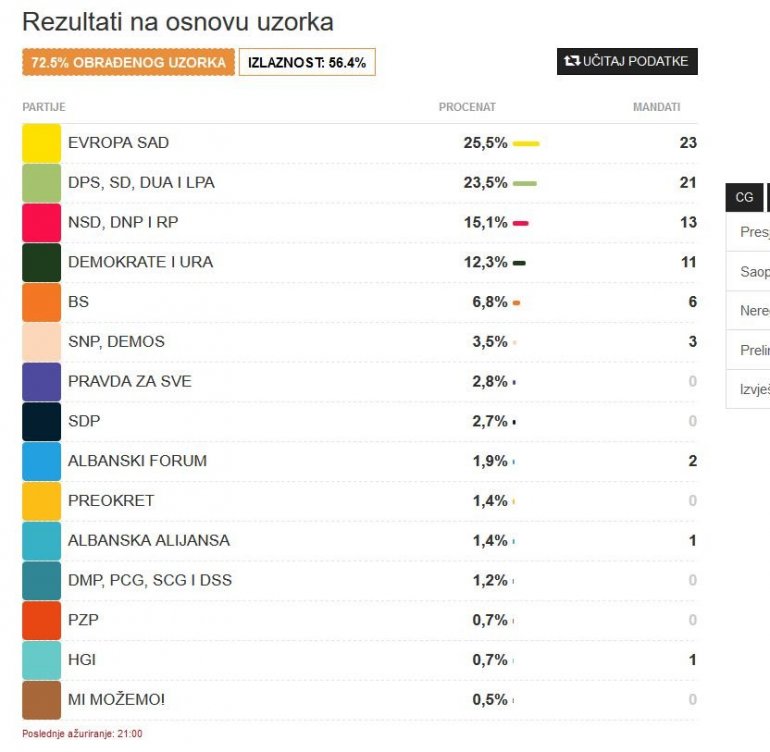 На основу 76.2 одсто обрађеног узорка, Покрет Европа сад освојио је 25.7 % гласова, или 23 мандата. ДПС, СД, ДУА и ЛПА имају 23.4 % гласова, односно 21 мандат, НСД, ДНП и РП са 15.1% -13 мандата, Демократе и УРА 12.3 % гласова и 11 мадната. БС је добио 6.8 гласова и тако обезбедио шест мандата, СНП и ДЕМОС са 3.5 % гласова има три мандата. Албански форум има 1,9 % и два мандата, а Албанска алијанса 1.4 % и један мандат, колико је, са 0.7 одсот гласова, добио ХГИ.