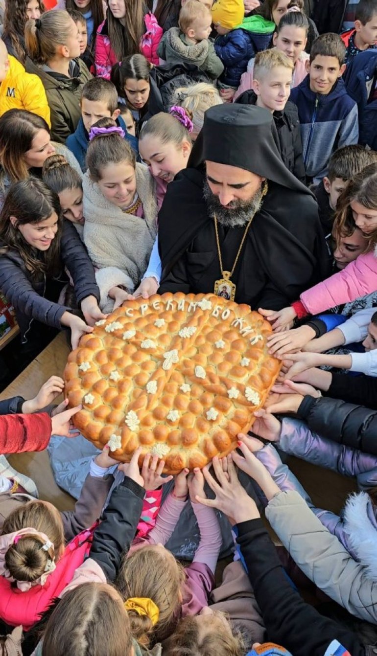 НАСТАВЉЕНЕ БОЖИЋНЕ СВЕЧАНОСТИ У БЕРАНАМА: Епископ Методије ломио чесницу са децом