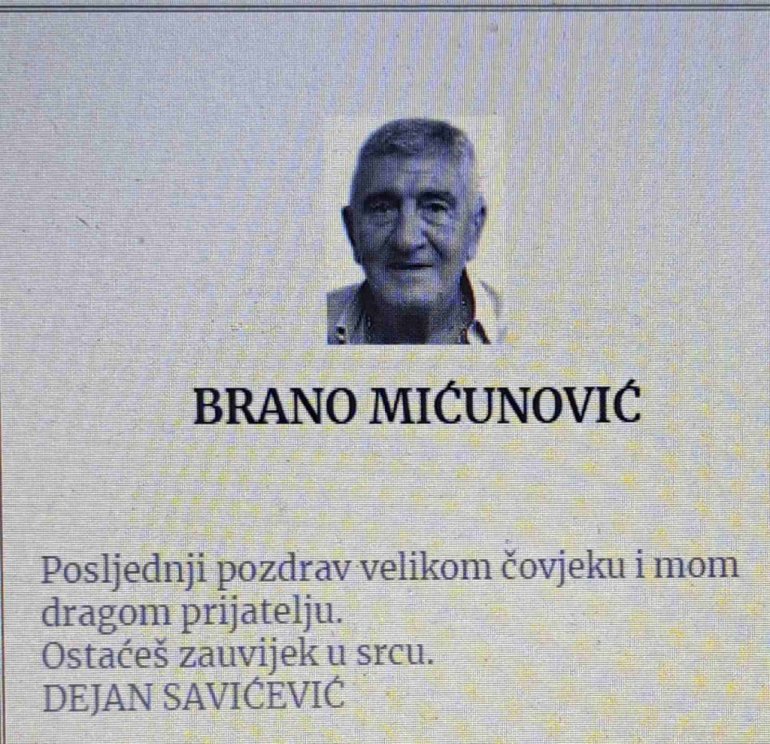 - Последњи поздрав великом човеку и мом драгом пријатељу. Остаћеш заувек у срцу - наводи се у читуљи Дејана Савићевића.
