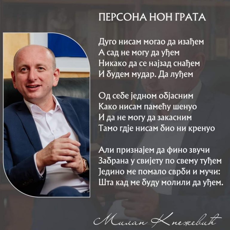 ЛИДЕР Демократске народне партије Милан Кнежевић у свом стилу одговорио на санкције званичног Загреба да му се ускрати улазак у Хрватску. Он је тим поводом на друштвеној мрежи Инстаграм поделио песму под називом "Персона нон грата".