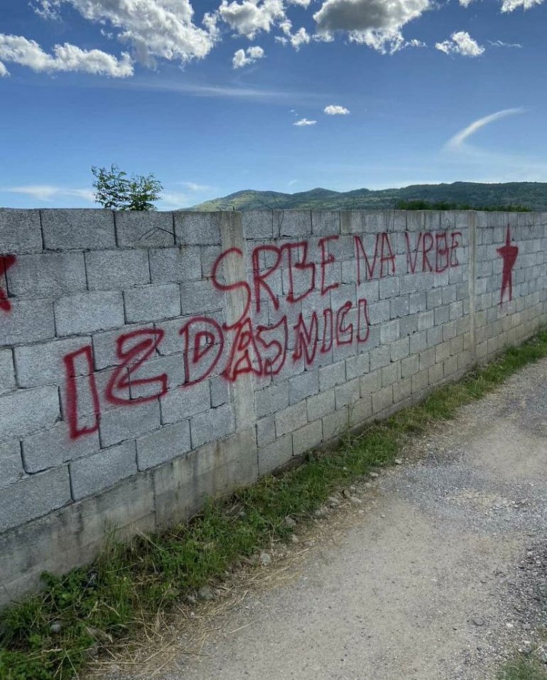 На зиду је освануло - "Е вива, Србе на врбе", "Ви на Ловћен никад, тамо ви је Косово"!