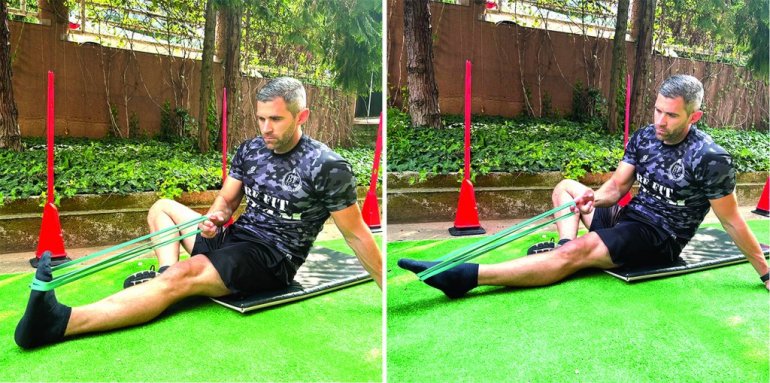 Еластичном гумом затегните стопало у висини прстију на ногама. Руком дозирате јачину и оптерећење. Полако опружите стопало до границе бола и затим га вратите у првобитан положај. Урадите 15 до 20 понављања ове вежбе у четири серије.