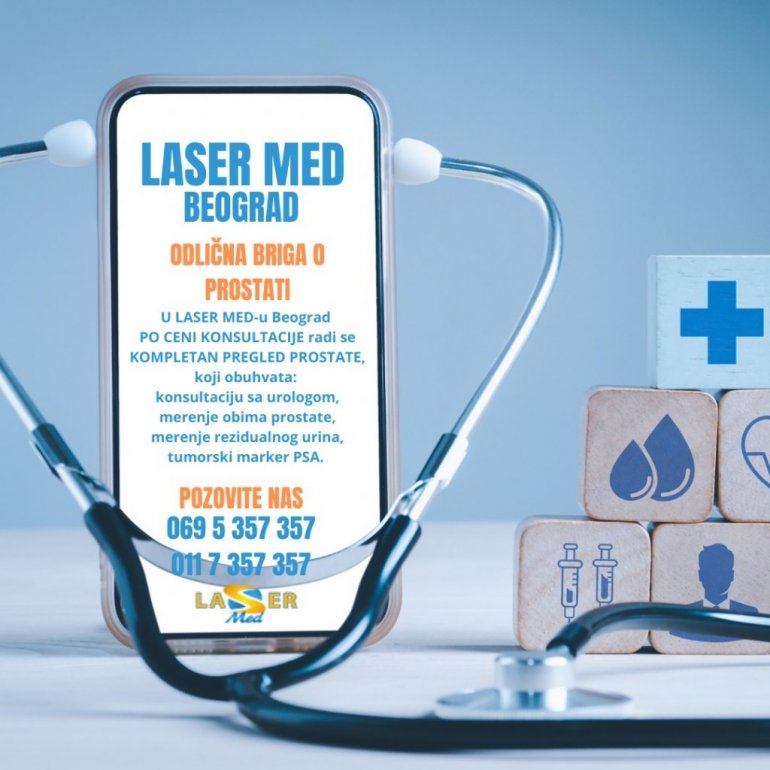 У ЛАСЕР МЕД-у Београд ПО ЦЕНИ КОНСУЛТАЦИЈЕ ради се КОМПЛЕТАН ПРЕГЛЕД ПРОСТАТЕ, који обухвата: консултацију са урологом, мерење обима простате, мерење резидуалног урина, тумор маркер ПСА.