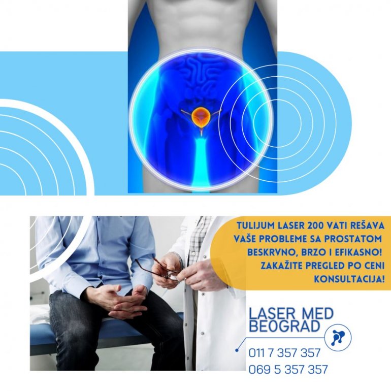 У ЛАСЕР МЕД-у Београд ПО ЦЕНИ КОНСУЛТАЦИЈЕ ради се КОМПЛЕТАН ПРЕГЛЕД ПРОСТАТЕ, који обухвата: консултацију са урологом, мерење обима простате, мерење резидуалног урина, тумор маркер ПСА.
