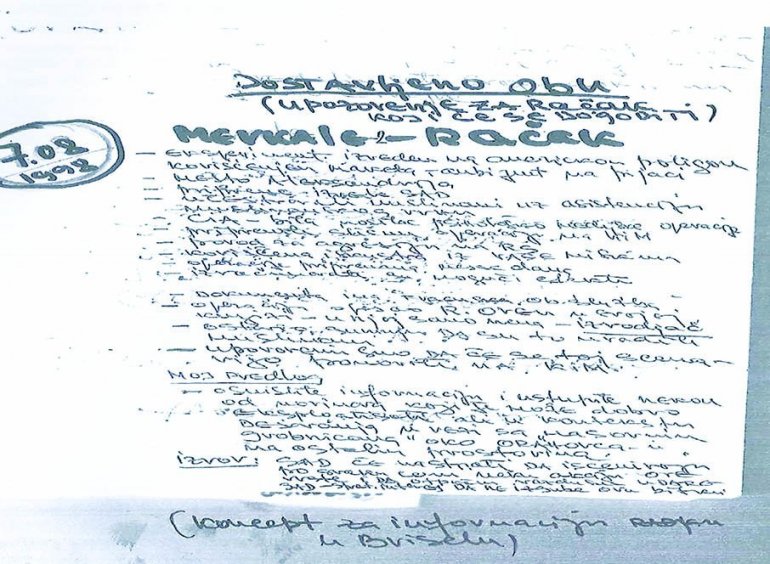 Значи, Милановић је већ почетком августа, пола године пре инсценирања масакра у Рачку 15. јануара 1999. године, који је послужио као директан повод за агресију на СР Југославију, упозорио Обавештајну управу Генералштаба, па тако и државни врх, на то да ће се тако нешто догодити и да ће повод за агресију на СР Југославију бити инсцениран по моделу психолошких операција које су постале устаљена пракса НАТО пакта. Као ексклузиван документ генерал Милановић нам је уступио фотокопију свог концепта на основу којег је саставио извештај у Бриселу и доставио га Обавештајној управи ГШ у Београду. У тренутку када нам је предао фотокопију концепта, на њој је својом руком уписао да је то било „упозорење за Рачак који ће се догодити“ и повезао то са претходним масакрима на сарајевској пијаци Маркале. Оно што је овде битно јесте то да је рано упозорење резултат доброг функционисања обавештајне мреже „Олимпик“, којој ништа више од важних одлука НАТО машинерије није могло да промакне. Све је беспрекорно функционисало и ништа за нас више није било тајна када су у питању припреме за агресију.