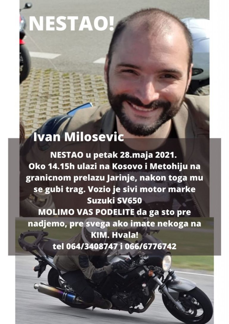 - Последње информације су да га је видео један камионџија код скретања за Звечане. Од тод тренутка му се губи траг. Оно што сам добио као информацију у претходних сат времена јесте да у наставку те руте, у граду Вучитрн, на централном кружном току, на сигурносним камерама између 14 и 17 часова није забележено да је прошао било који мотоцикл - прича Милош.