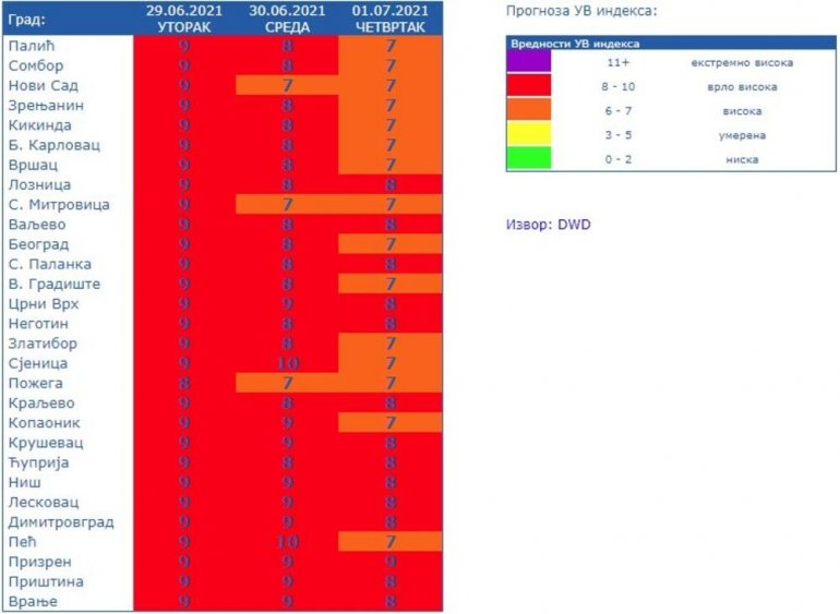 Индекс УВ зрачења у целој Србији је у категороји веома опасна појава и означена бројем 9, осим у Пожеги где је осам.
